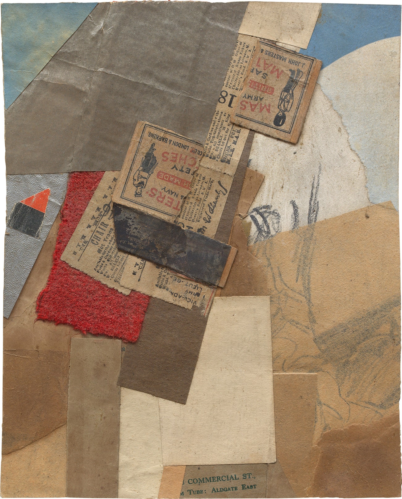 pencil and paint on paper and cardboard, paper and fabric collage on paper