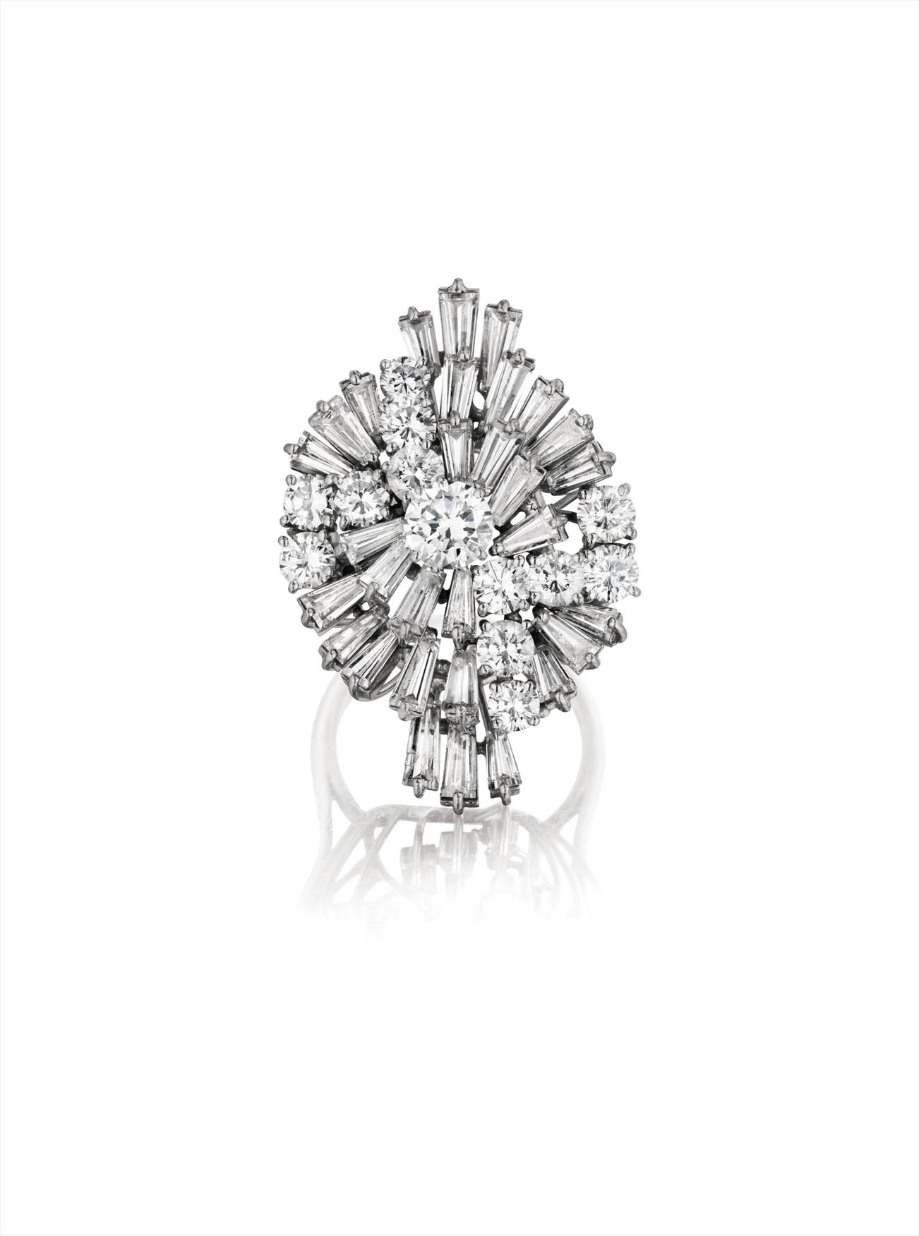 Designed as a circular and tapered baguette-cut diamond spray ring, mounted in 18K white gold, size 7.