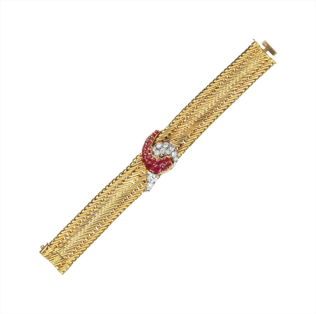 Centering upon a cross-over motif of circular-cut diamonds and rubies, opening to reveal a watch of mechanical movement with a silver dial, gold markers and hands, to the woven polished gold bracelet, mounted in 18K yellow gold, length 7 inches.