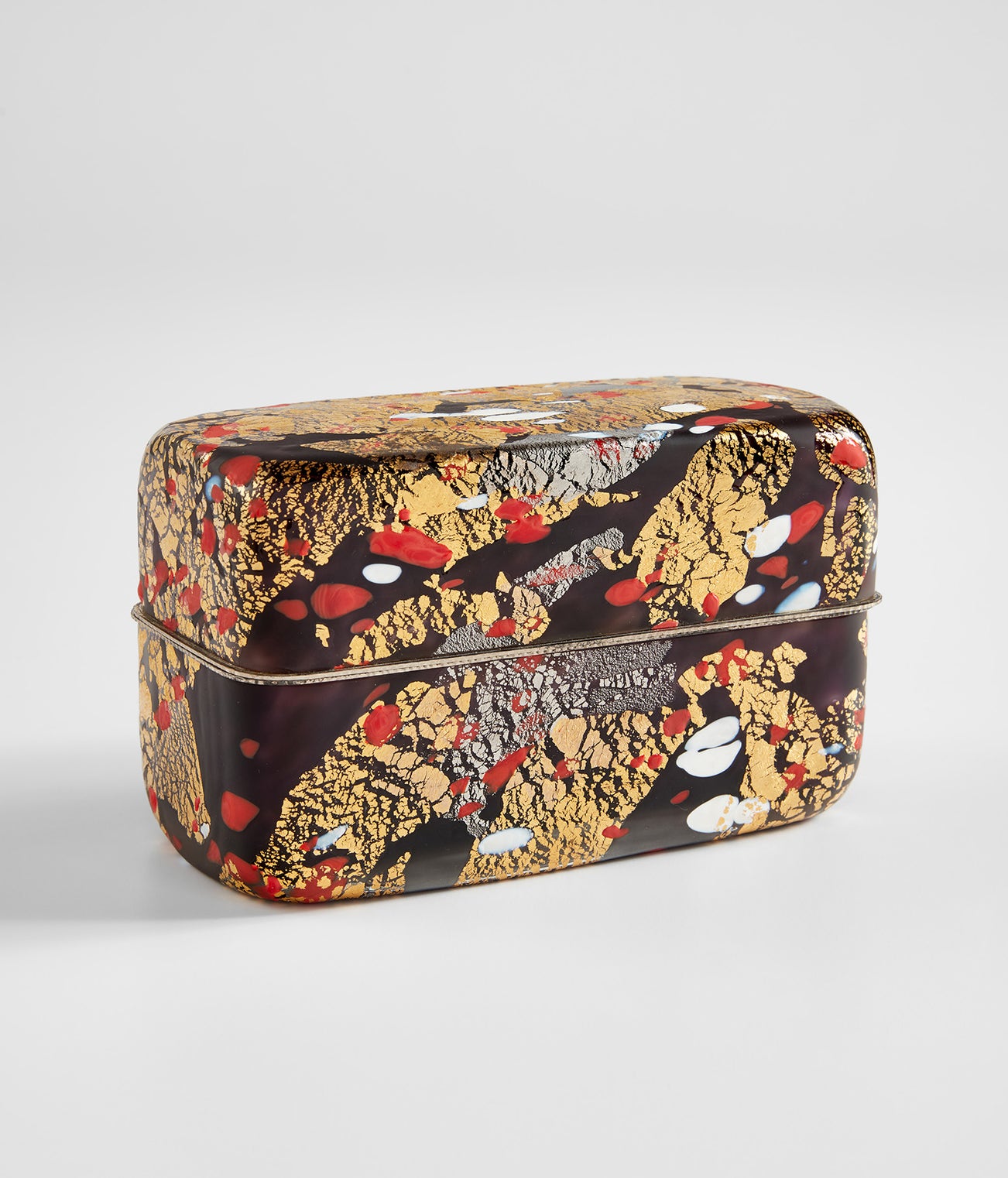 Blown glass with gold and silver leaf, silver-plated metal.