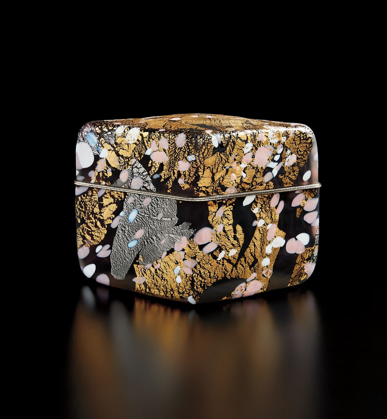 Blown glass with gold leaf, silver-plated metal.