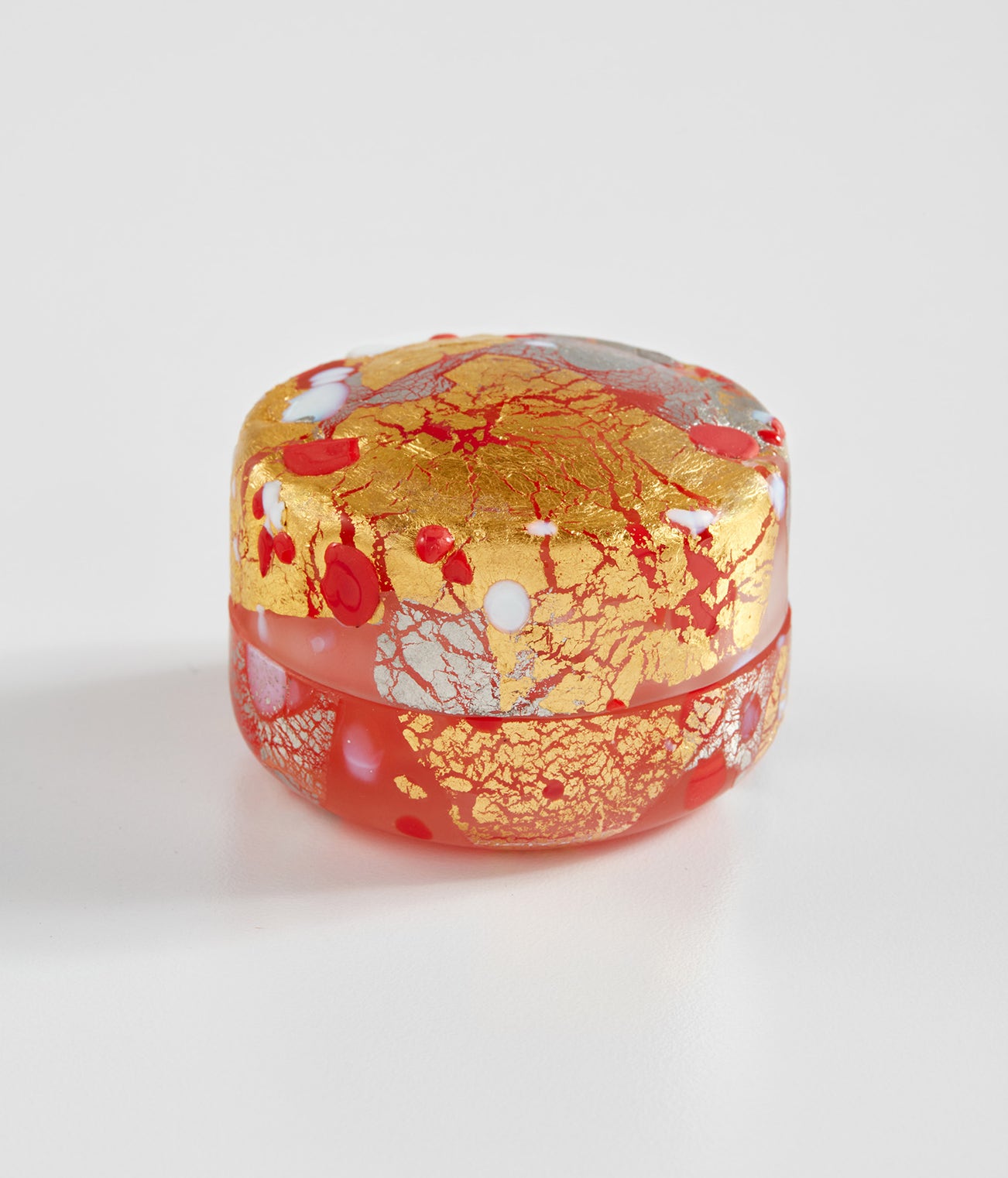 Blown glass with gold and silver leaf.