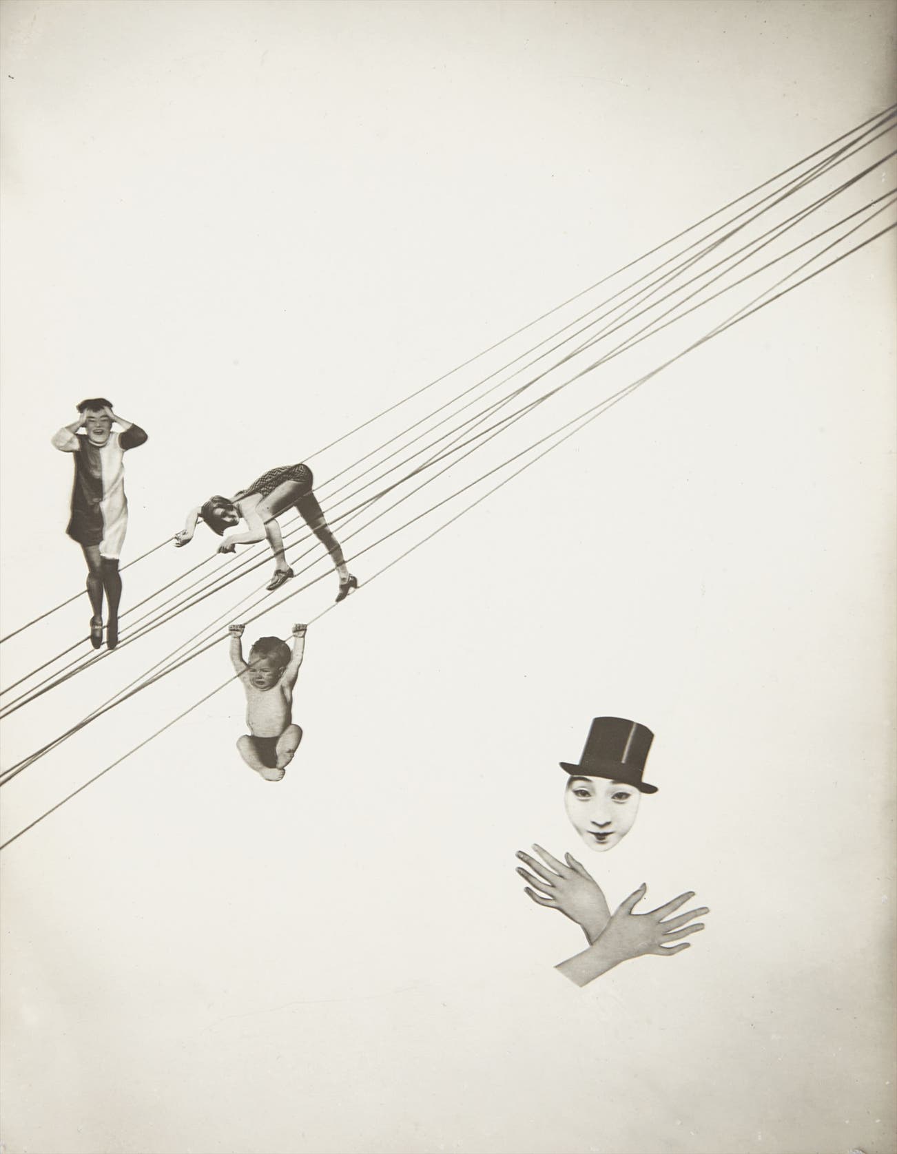 Louis Kaplan, in his book on Moholy-Nagy’s biographical writings, discusses Mein Name ist Hase as an autobiographical photomontage or a self portrait that “….deploy(s) tactics to ‘unname’ or ‘misrecognize’ the autobiographical subject…” Indeed, Mein Name ist Hase can be seen as a portrait of the artist. He is the rabbit-faced magician floating in an undefined space above two crossed hands. Moholy-Nagy believed that artists must forget historical and traditional suppositions (as represented in the current image by the three figures perched-upon, entangled-in, or hanging from a platform of diagonal lines) in order to be conscious of their present moment. Indeed, Moholy-Nagy believed that relinquishing ties to the past would allow for his newly modernized society to freely see their contemporary era and envision their future.