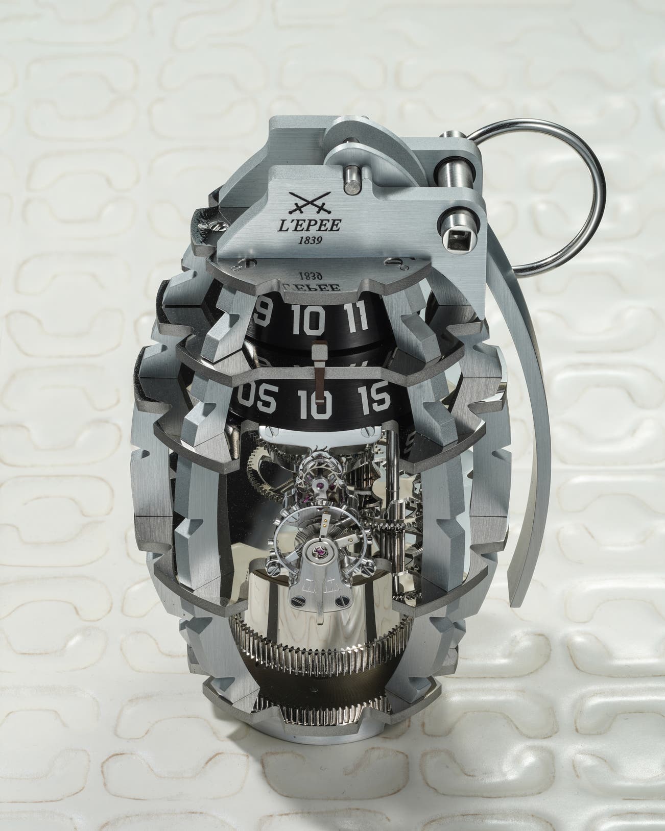 - The live grenade beats thanks to the L’Epée 1839 movement cal. 1855, designed and manufactured in-house and boasting an 8 day power reserve. The movement is wound thanks to the use of a key-pin, safely stored in the fuse-shaped frame atop the structure. To set the time the pin is simply inserted onto a post in the center of the top plate, whilst the mainspring barrel is wound from a post on the bottom of the clock.