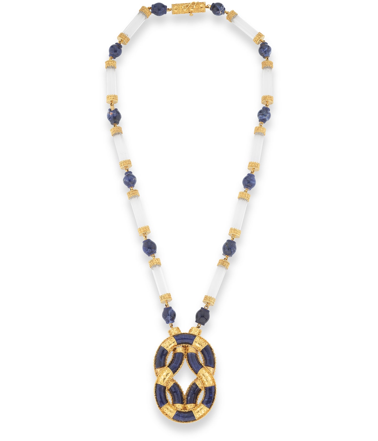 The chain set with alternating sodalite beads and rock crystal columns, supporting a gold and sodalite pendant, length approximately 650mm, signed Lalaounis, numbered.