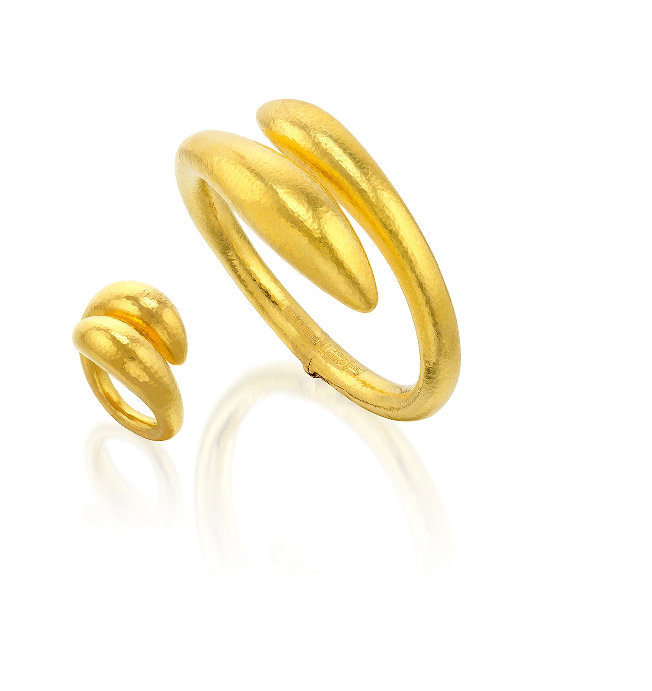 A hammered gold hinged bangle of bypass design, and a ring en suite, mounted in yellow gold, signed Lalaounis, numbered, inner circumference approximately 160 mm, ring size 6¼.