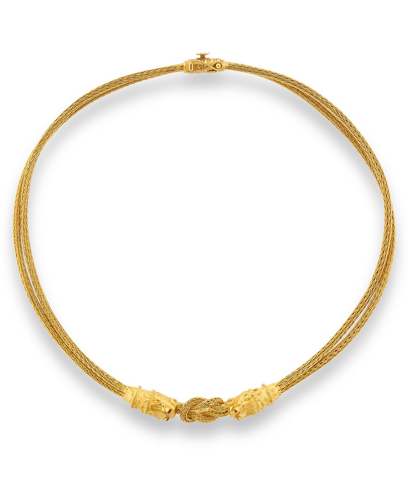 Modelled as two lion heads, with ruby-set eyes, length approximately 390mm, signed Lalaounis, French assay marks for gold.