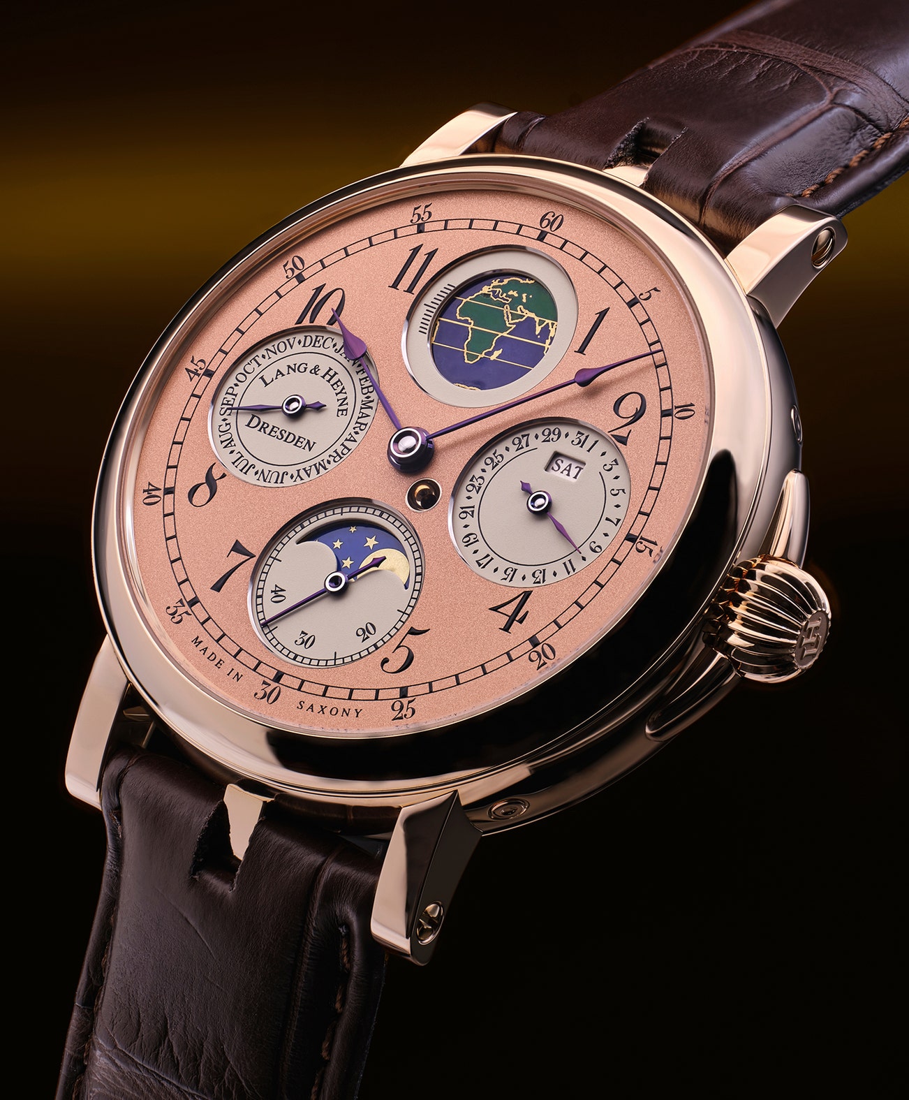 A unique, “like-new” and extremely attractive pink gold triple calendar wristwatch with enamel earth disc, small seconds, moon phases, additional special made salmon dial and set of purple hands, certificate and presentation box, made for the 11th anniversary of The Lavish Attic