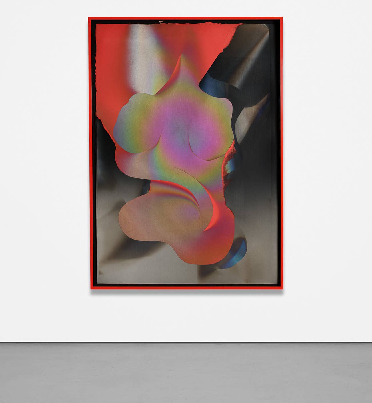 mixed media, aluminum and silicon monoxide on red Hiromi paper laid on canvas, in artist's frame