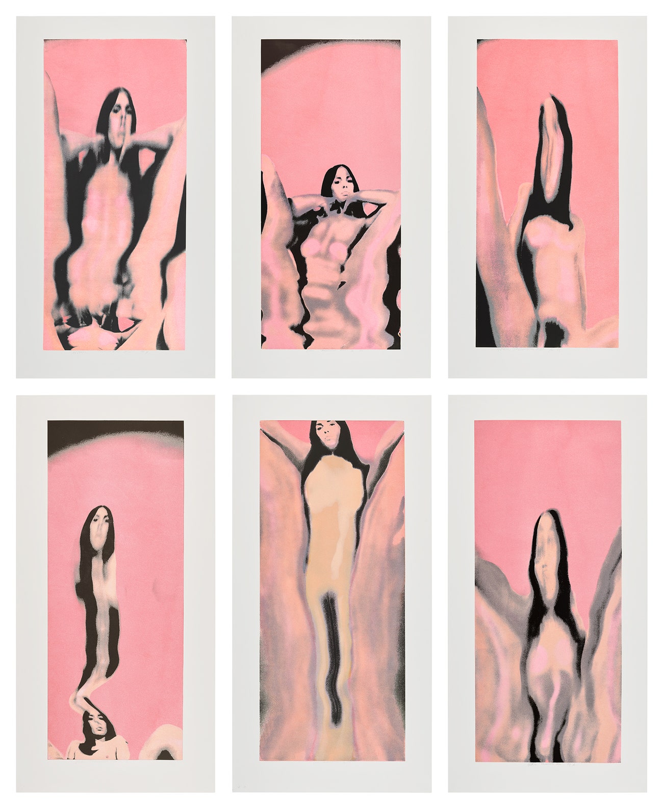 The complete set of six screenprints in colors with flocking in pink, on wove paper, with full margins.