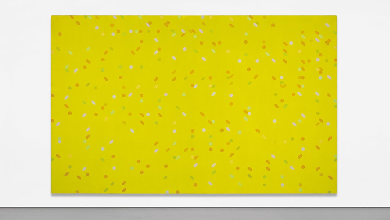While the decentralized, all-over composition in the present work allows for variable orientation, Jessica’s Hartford is perhaps strongest in a horizontal format, a favored structure within Poons’s broader oeuvre, and one that obliquely connects his abstractions to the mode of landscape painting. Suffused in shades of yellow, Jessica’s Hartford indeed seems to catch the light in a manner that is evocative of Claude Monet’s abstracted landscapes of waterlilies. It is no coincidence that Patti Smith once lauded Poons as “our cowboy Monet” in the 1970s. Poons created his Dots paintings only for a short period between 1963 and 1967, before steering his practice towards gestural abstraction, making Jessica’s Hartford an important early painting within Poons’s oeuvre that beautifully captures light, rhythm and color in a manner that seems to expand beyond the confines of the canvas.