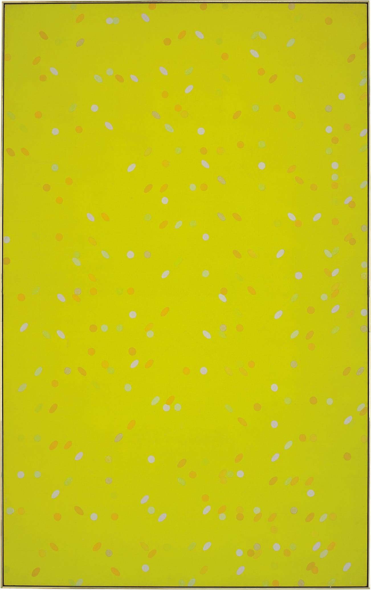 Jessica’s Hartford, painted in 1965, is the epitome of this celebrated early series by Larry Poons. Vivid orange, lime green and white ovals glitter across the entire canvas, which is painted in a striking chartreuse tint. The haphazard patterning of the dots creates the illusion of space that repeatedly fools the eye. There is a structure, to be sure, but one cannot quite grasp where its logic lies. The painting suggests a rationale the viewer can expect to follow, only to then abandon it and disrupt any notion of an orderly composition. There is an unresolved playfulness in the work that both delights and frustrates. This visual complexity is precisely what the influencers of the time were responding to in their praise of the series.