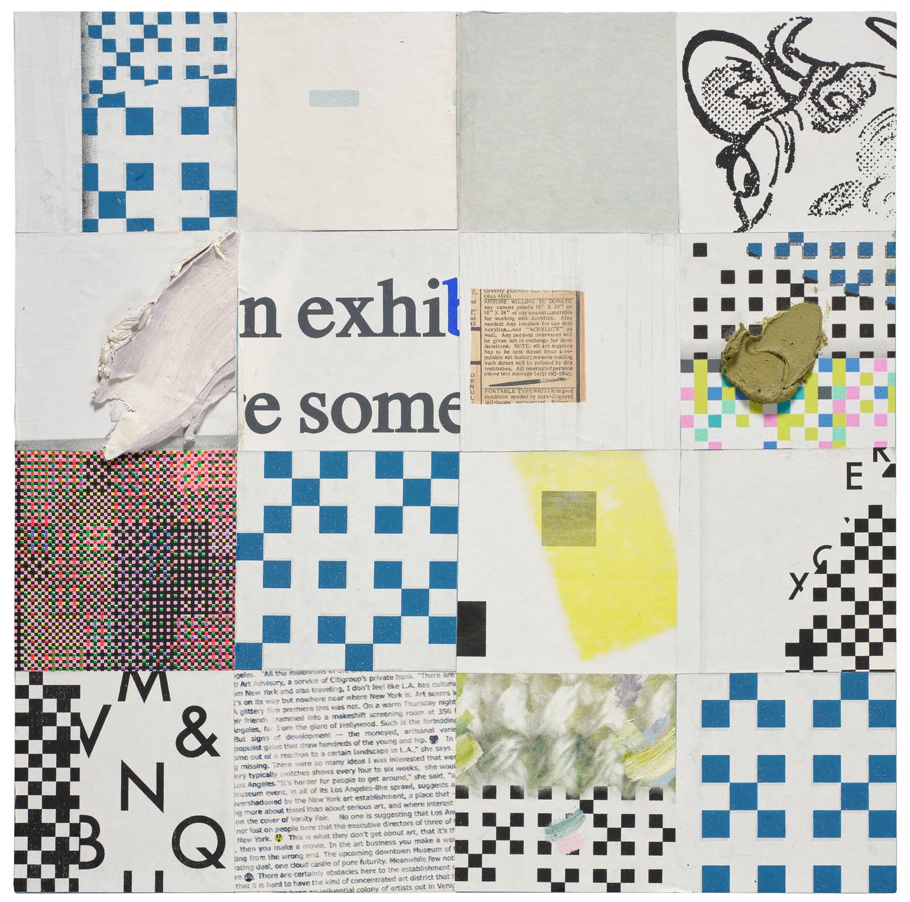 oil, Flashe, screenprinting ink and sand on hand-finished wallpaper collage, mounted to board