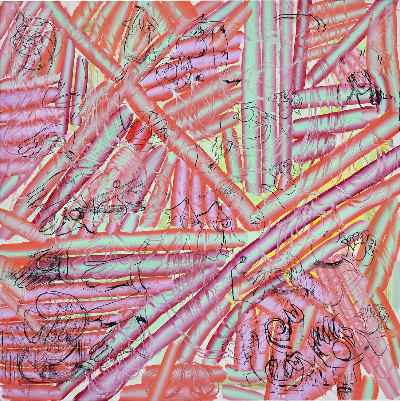 Lauren Quin (b. 1992) lives and works in Los Angeles, California. She holds an MFA from the Yale School of Art, New Haven, CT and a BFA from the School of the Art Institute of Chicago, Chicago, IL. She forms her canvases by painting repeated, intercepted, and reconnected shapes and colors. She is most known for the “tube” shape throughout her compositions. Her work has been the subject of solo exhibitions including her first US museum show My Hellmouth, Nerman Museum of Art, Overland Park, KS (2023); Sagittal Fours, Pond Society, Shanghai, China (2022); Pulse Train Howl, Blum & Poe, Los Angeles, CA (2022), and group exhibitions such as Fire Figure Fantasy: Selections from ICA Miami’s Collection, Institute of Contemporary Art, Miami, FL (2022); and On Boxing, Blum & Poe, Los Angeles, CA (2021).