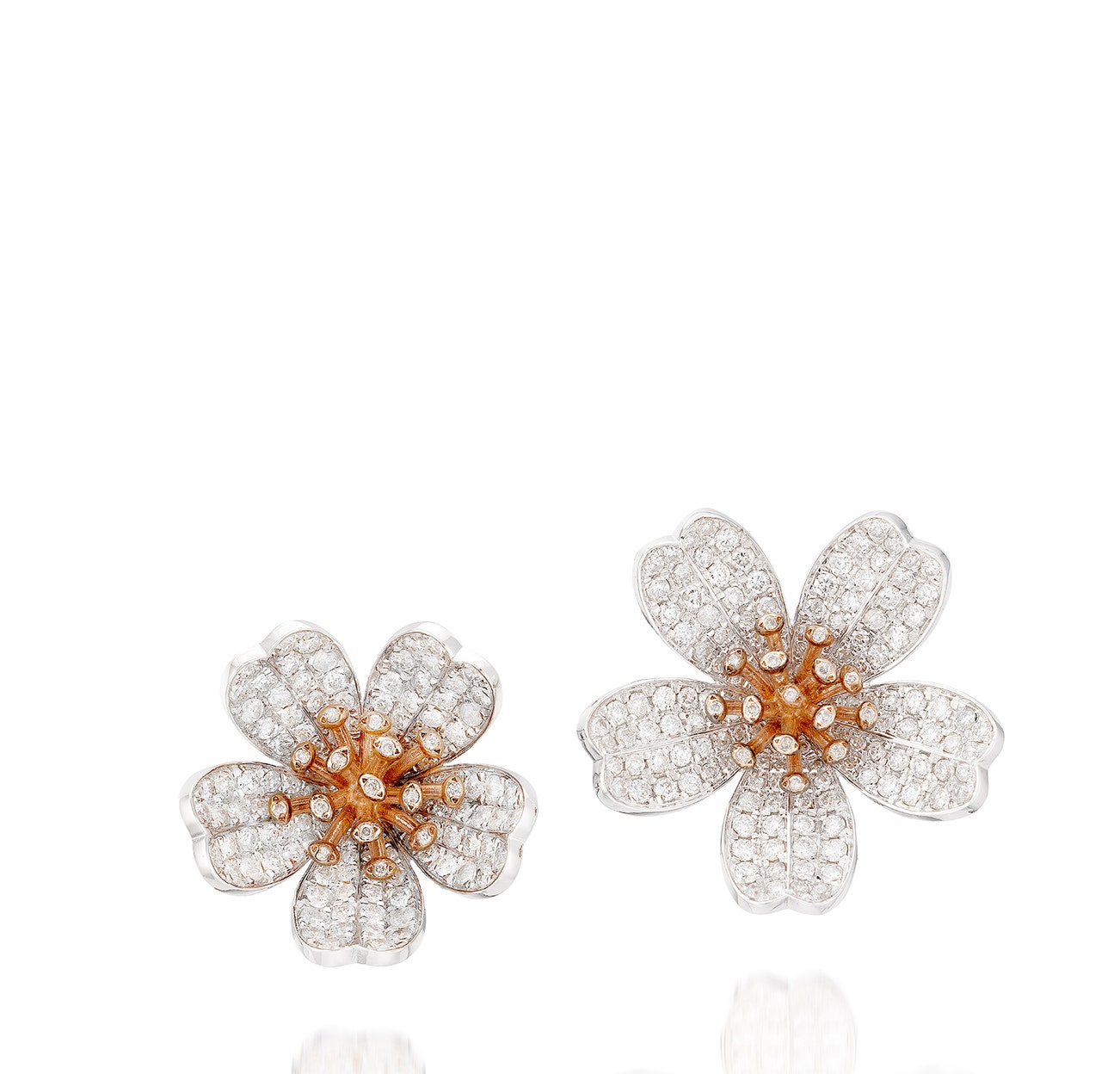 Of asymmetrical design, the cherry blossoms pavé-set with brilliant-cut diamonds, mounted in white and pink gold, post and hinged back fittings, signed Lauren X Khoo, numbered, maker's mark, length approximately 18.4 mm and 22.1 mm respectively, pouch stamped Lauren X Khoo.