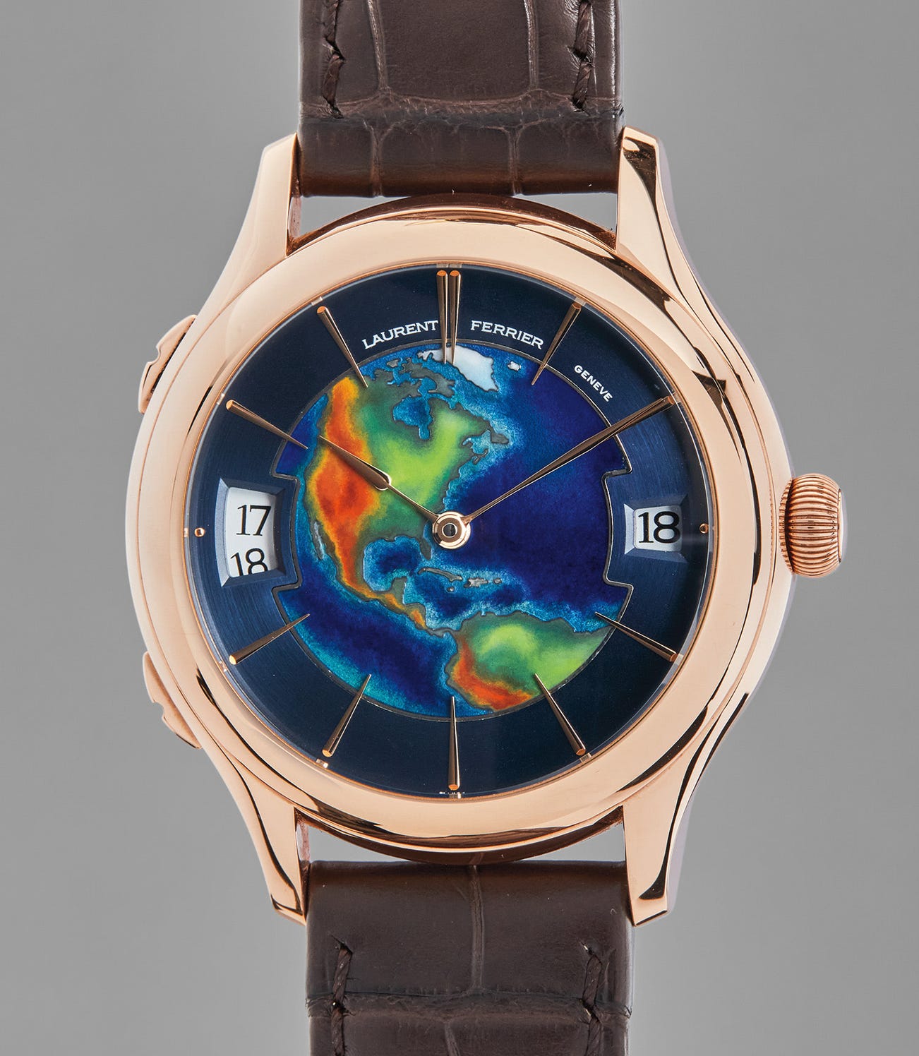 The present example is a very rare edition of only five examples made in pink gold in 2014 with a multi-chrome cloisonné map depicting North America, the Caribbean and northern South America. Similar to the mid-20th century masterpieces, the watch is designed for travellers to keep track of time both at home and local time. The dial is asymmetric with the GMT aperture (home time) at the 9 o’clock position larger in proportion to the date wheel at 3 o’clock, giving more emphasis to the 24-hour dial. The 41mm diameter case features small pushers at 8 and 10 o’clock, which allows for easy time change of the hour hand (travel time), moving it either forwards or backwards. The beauty and superior craftsmanship of the exquisite dial is matched by the exceptional in-house movement with 22K gold guilloché micro-rotor regulated by the innovative, double direct impulse escapement.