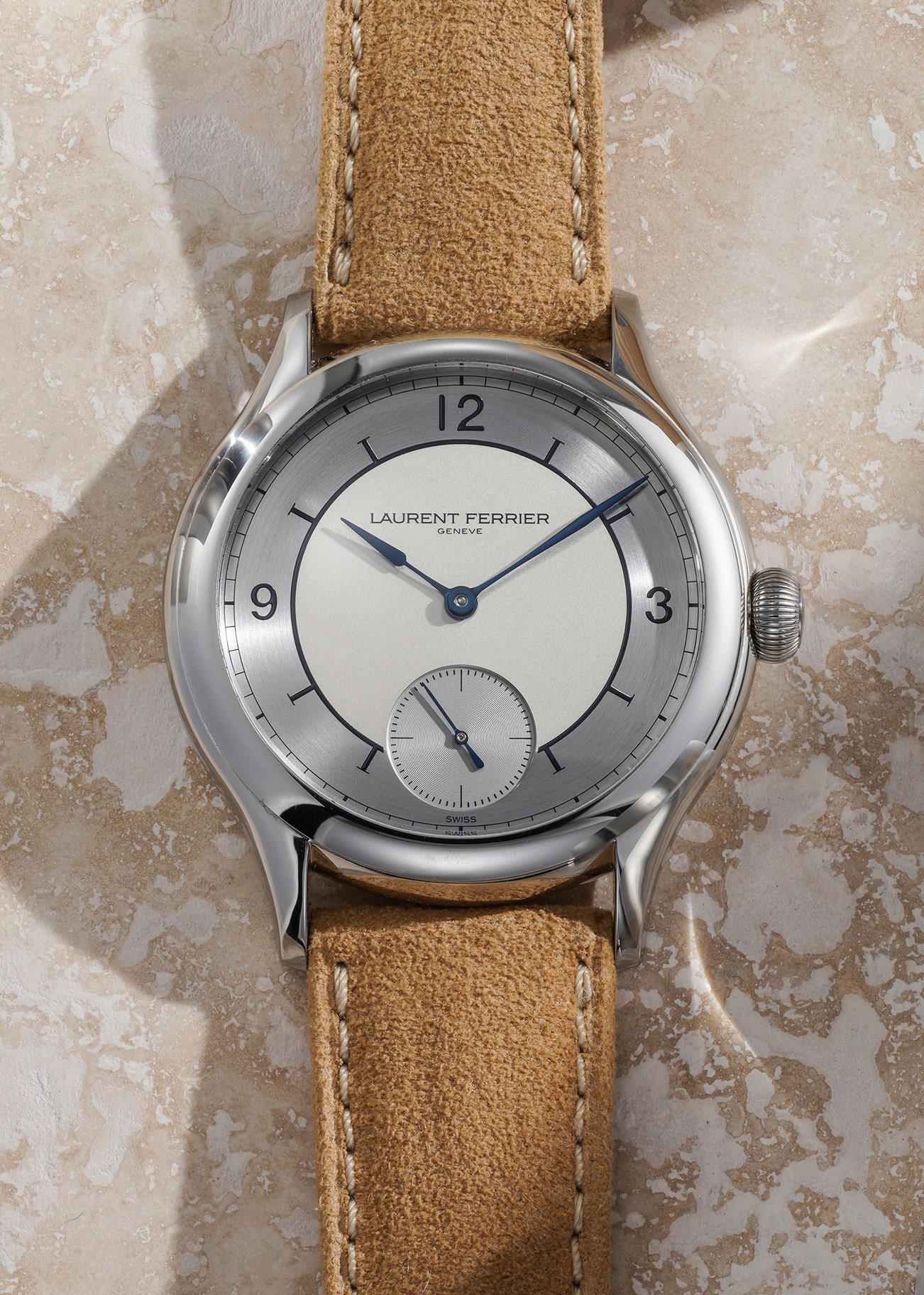 - Featuring an extremely refined two-tone sector dial, it is made up of a central disc in white opaline and a silver grey circular brushed outer track. Arabic numerals at 12, 3, and 9 give the final touch of balance to the sector dial. The signature blued Assegai-shaped hands are present as one would except from a classical Laurent Ferrier, however an additional set of blued steel LumiNova-filled hands are also available to render the timepiece more "scientific".