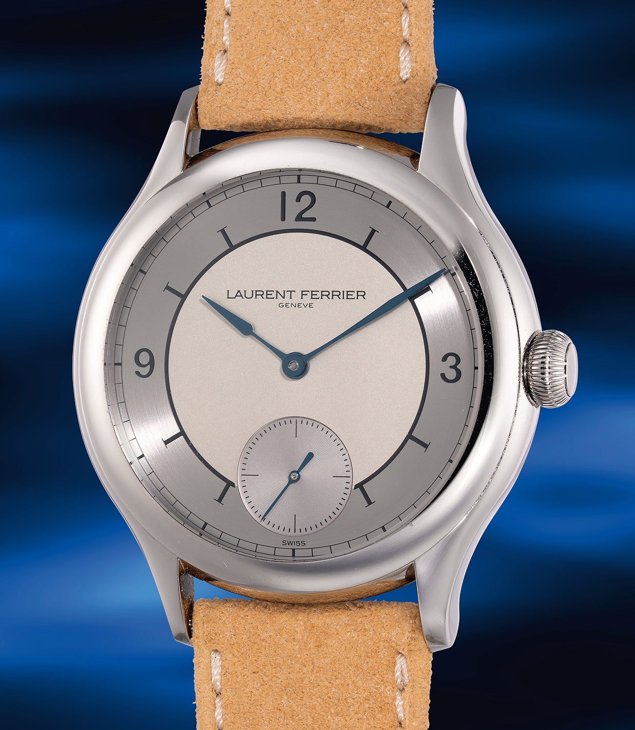This exquisite timepiece features a highly refined two-tone sector dial, comprising a central disc in white opaline and a silver-grey circular brushed outer track. Arabic numerals at 12, 3, and 9 provide a perfect sense of balance to the sector dial. The signature blued Assegai-shaped hands are a hallmark of Laurent Ferrier's classic aesthetic and the additional set of blued steel hands filled with LumiNova is included for versatility.