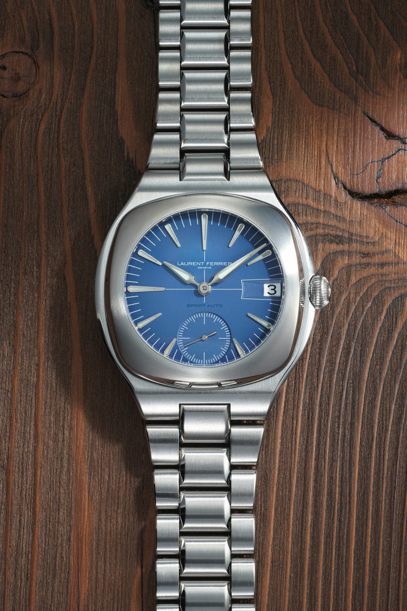 - Laurent Ferrier's interpretation of the quintessential sports watch, the Sport Auto, marks a distinct departure from the brand’s traditionally elegant dress watches, bringing a sportier aesthetic. The watch is inspired by the founders’ personal history in automobile racing — notably their participation in the 1979 24 Hours of Le Mans, where they finished 3rd overall in a Porsche 935. While still very much a "sports watch" with its integrated bracelet, blue dial and tonneau-shaped case, the smooth, flowing profile—evoking the aerodynamic bodywork of a high-performance car—connects the design to the rest of Laurent Ferrier’s creations, which are defined by fluid, rounded lines