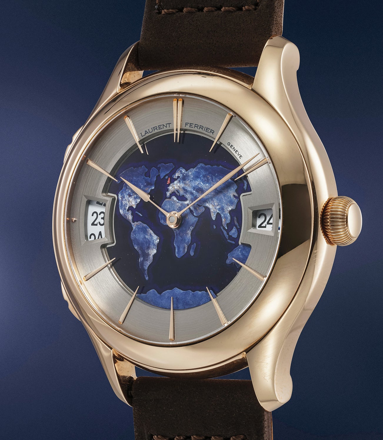 The dial, executed in champlevé enamel depicts the night sky over the globe. The enameller’s attention to detail has gone so deep that the artist has even painted the night lights of each region, with the UK being subtly painted in red.