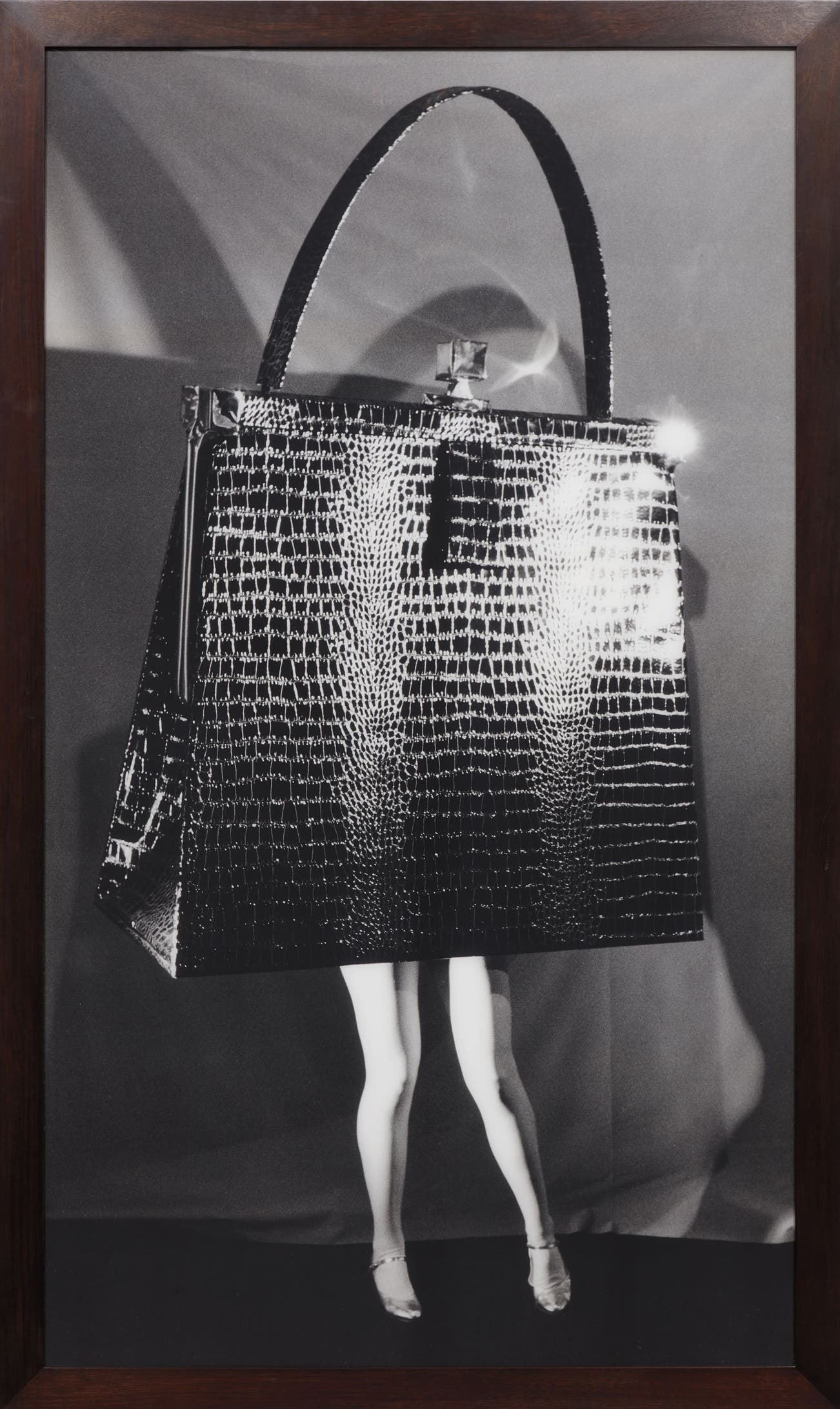 This oversized black-and-white photograph of a gigantic alligator skin purse with legs is undeniably Laurie Simmons. Walking Purse, 1988, created for her seminal series Walking and Lying Objects (1987-91), is one of only two instances where the object is worn by a real person. While this was her original intent for the series, she turned to using doll and mannequin legs out of necessity for the photographs that followed. The pair of legs we see here belong to her sister Bonnie who wore this human-size purse costume.