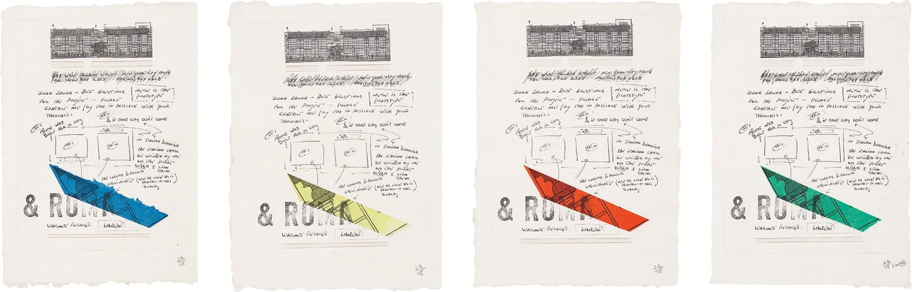 The complete set of four etchings in colours, with collage and hand-colouring in pencil, on wove paper, with full margins.