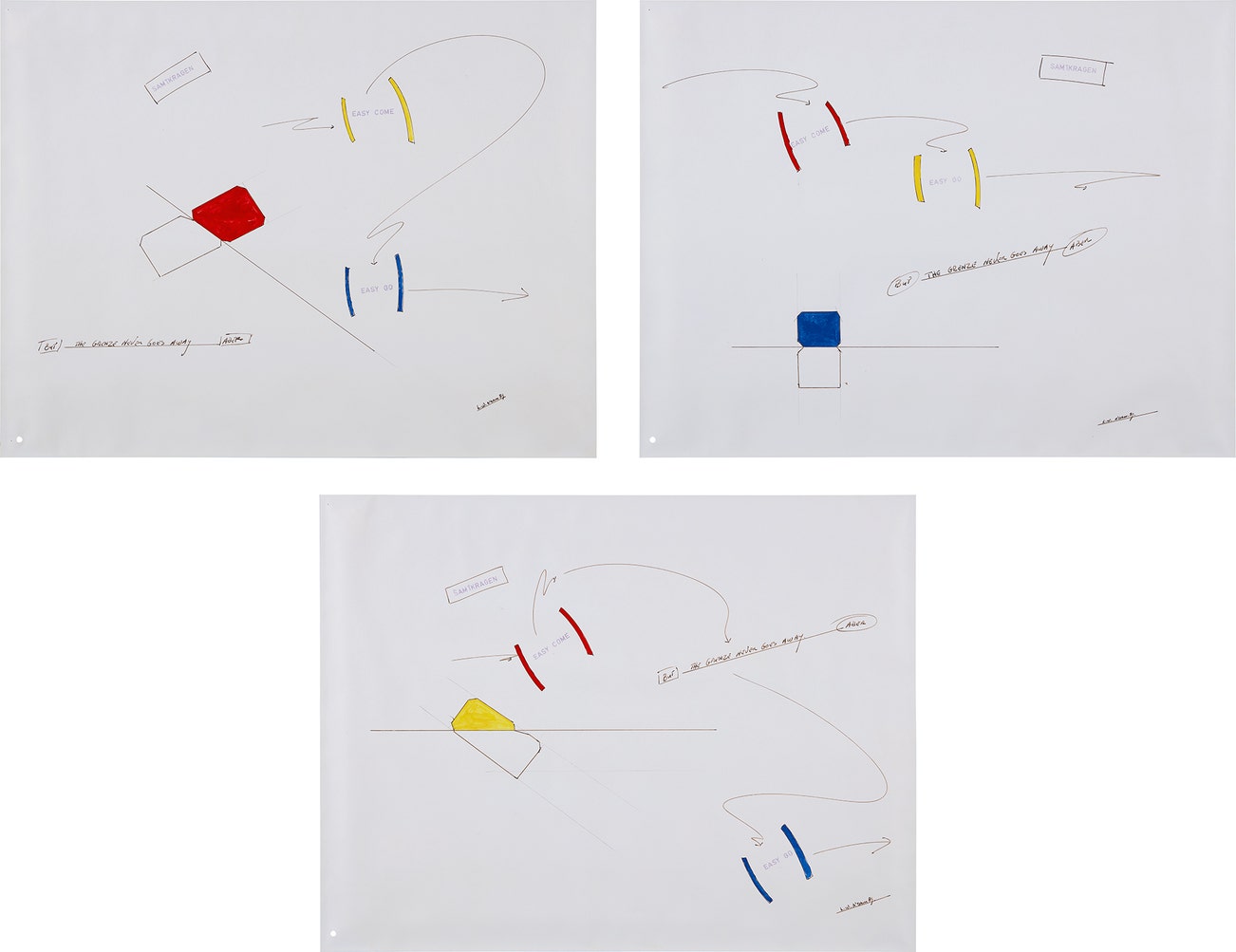pencil and ink on paper, in 3 parts