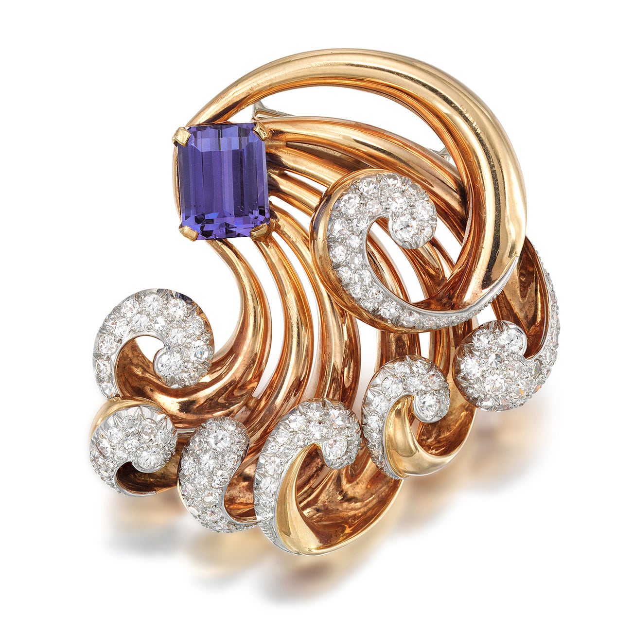 A Retro Tanzanite, Diamond, Platinum, and Gold Dress Clip