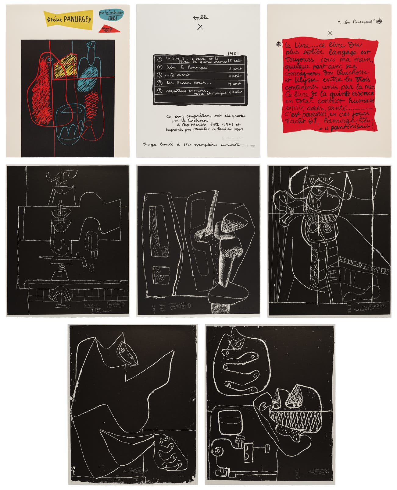 The complete set of five lithographs in black, on Rives BFK paper, the full sheets, with the accompanying title, text and colophon pages in colors, all loose (as issued), all contained in the original beige cloth-covered portfolio with printed cover.