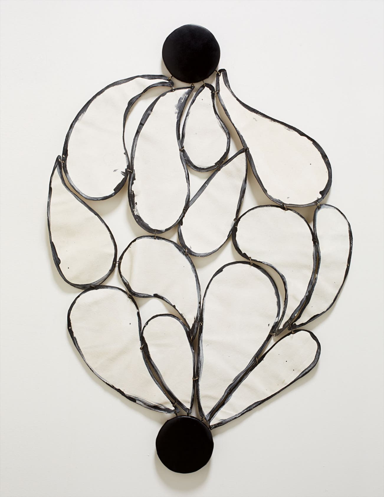 acrylic on canvas, metal rings, wood, and leather