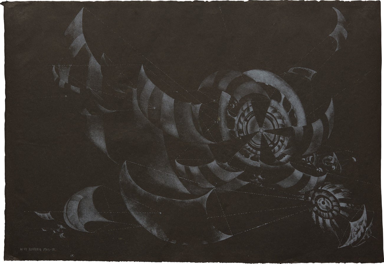 Lithograph in white, on black laid Japan paper, the full sheet.