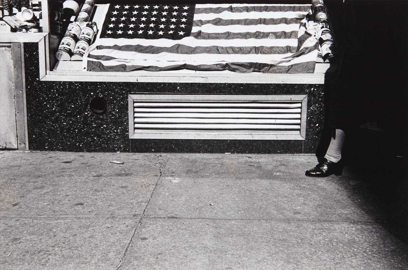 Lee Friedlander’s obsession with photographing on the streets, and breaking the conventional rules of photography is evidenced in the present lot, New York City, 1965. Though this picture demonstrates a keen observation of line and shadow, it comes with a quintessential Friedlander twist: the emergence of a passerby’s leg stepping into the right of the frame. By leaving in what others are taught to leave out, Friedlander wakes us up to the moment.