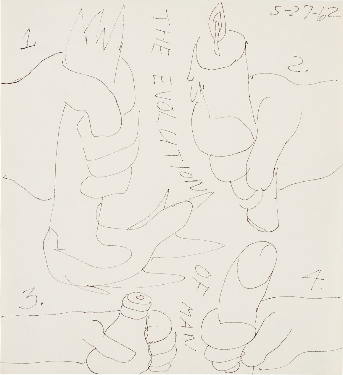 titled "THE EVOLUTION OF MAN" center and dated "5-27-62" upper right; further signed and dated "LEE '62" on the reverse