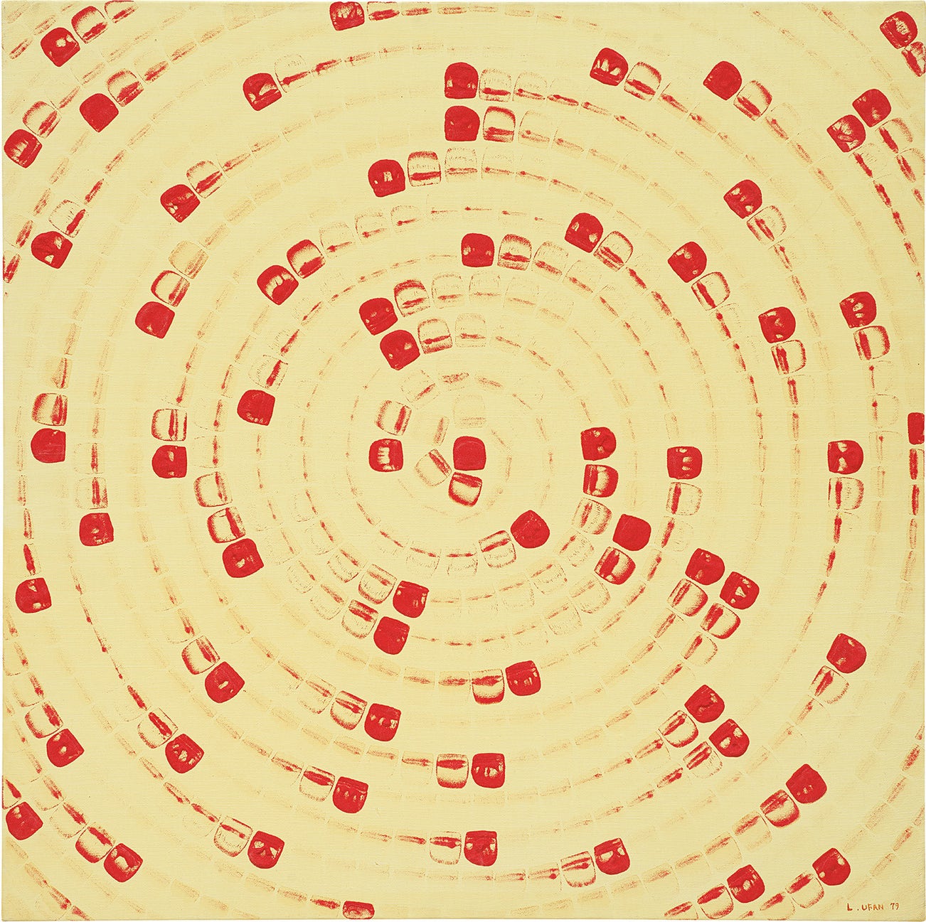 From Point No. 7901256 belongs to the artist’s From Point (1972-1984) series of works executed over a period of 12 years. In this series, he restricted his palette to a single pigment applied onto the white canvas: cobalt blue or burnt orange, evoking sky and earth respectively. Lee also began using the East Asian method of painting with the work surface flat on the floor, involving his entire body as he hovered over the canvas. This particular work is covered with the artist’s characteristic squared dots applied methodically and repeatedly until the paint on the brush has run near-dry. Unlike the more common linear compositions from the same series (see for example the artist’s work of the same name from the same year and series), it belongs to the group of works created from 1977 onwards in which the red spiralling composition creates a delicate, pulsating tension, enveloping and drawing the viewer into the heart of the painting. These paintings involving points spiralling out in circular forms were first presented in July 1978 at his first European solo museum exhibition at the Stadtische Kunsthalle, Dusseldorf. In these works, Lee draws a fine balance between the painted and unpainted, with progressively larger amounts of empty space left between points, allowing the interaction of negative and positive space to transcend the canvas surface.
