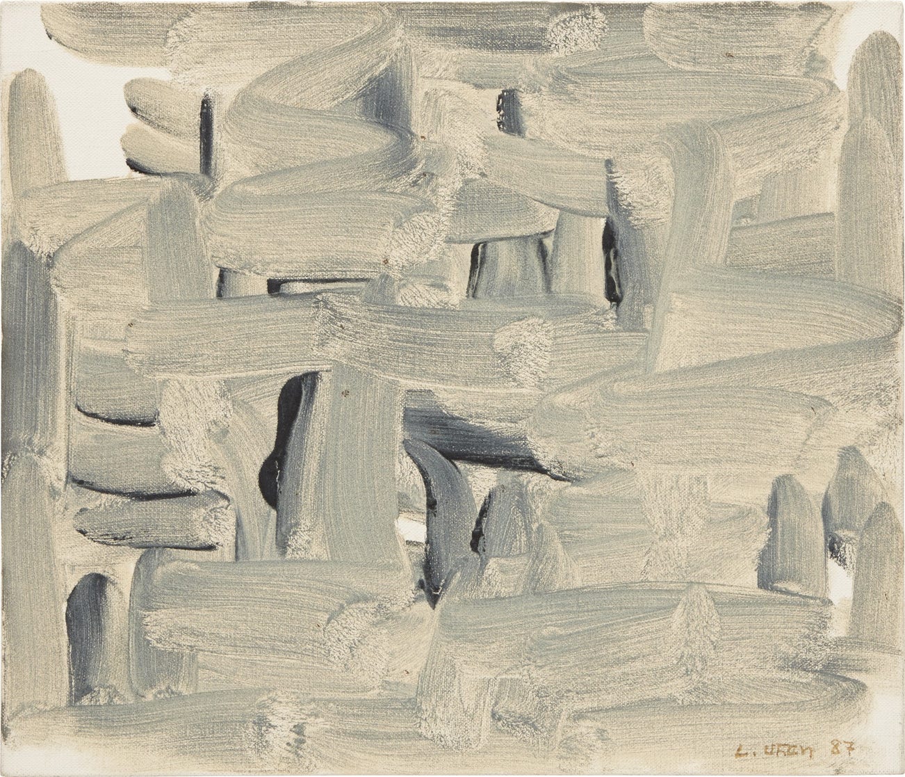 Signed and dated "L. Ufan 87" lower right; further signed twice, titled, dated and inscribed "with winds 1987-10 Lee Ufan M. Martine Matyas 19. dec 1987 Lee Ufan" on the reverse.