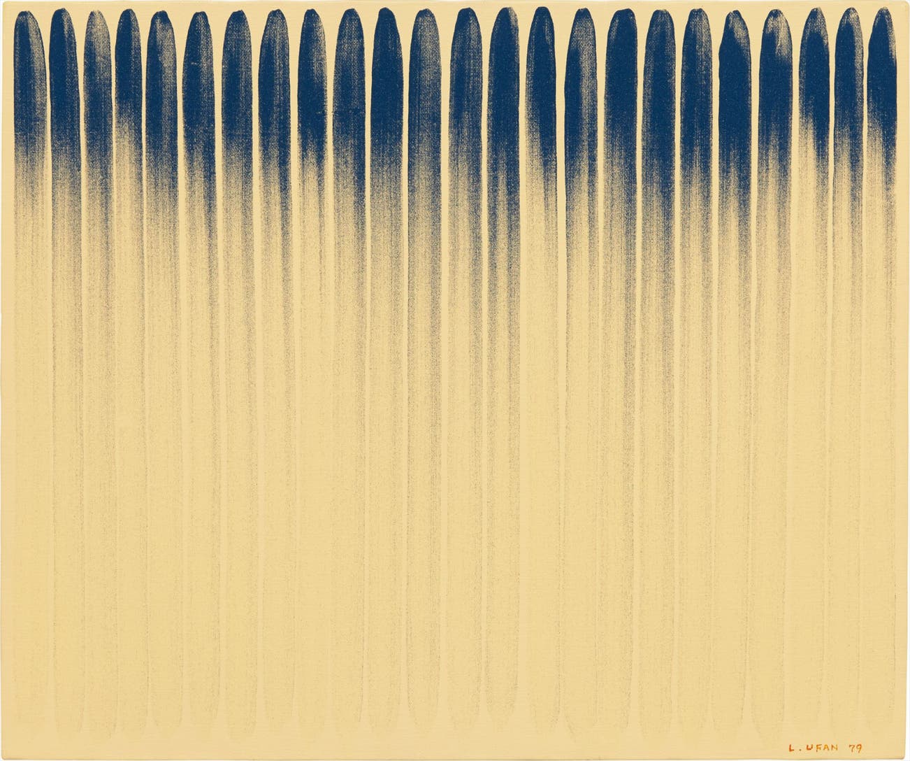 Dichotomies between marked and unmarked, painted and unpainted are revealed through the 24 blue lines that travel vertically down the canvas of Lee Ufan’s From Line, No. 790143 of 1979. The present lot represents an elegant example from Ufan’s iconic From Line series, which depict a series of repeated parallel blue lines. As a member of the Mono-ha movement, Ufan disregarded pictorial imagery and veered his interest towards the minimalist forms produced from simple, raw materials. The specially hand mixed paint and the use of artificial hair brushes maximizes the friction between paint and surface as the brush is pulled steadily down the composition from top to bottom. The paint, once potent at the top of the composition, gradually diminishes as it runs thinner and thinner and finally falls off the lower edge the canvas. This stunning technique results in what Ufan describes as a “mediating effect that empties out its surroundings and brings some kind of transcendence to the place where it is” (Lee Ufan, The Art of Encounter, Lisson Gallery, London, 2004).