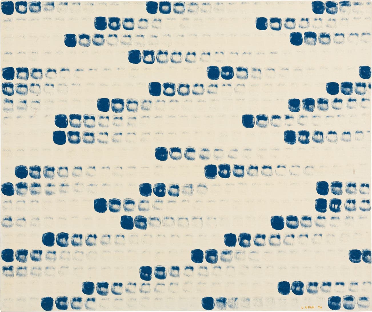 The Mono-ha school of thought rejected Western notions of representation, choosing to focus on the relationships of materials and perceptions rather than on expression or intervention. A complete departure from the tenets of the Guitai movement, which dominated the previous decade in Japan. The movement's goal was to embrace the world at large and encourage the fluid coexistence of numerous beings, concepts and experiences. It is this intellectual trajectory that best informs Lee Ufan’s paintings. Lee began to paint in earnest in the early 1970’s and his first major series of paintings are his From Point works, executed between 1973 and 1984. From Point no. 760128 (1976) is a hauntingly beautiful example of this series.