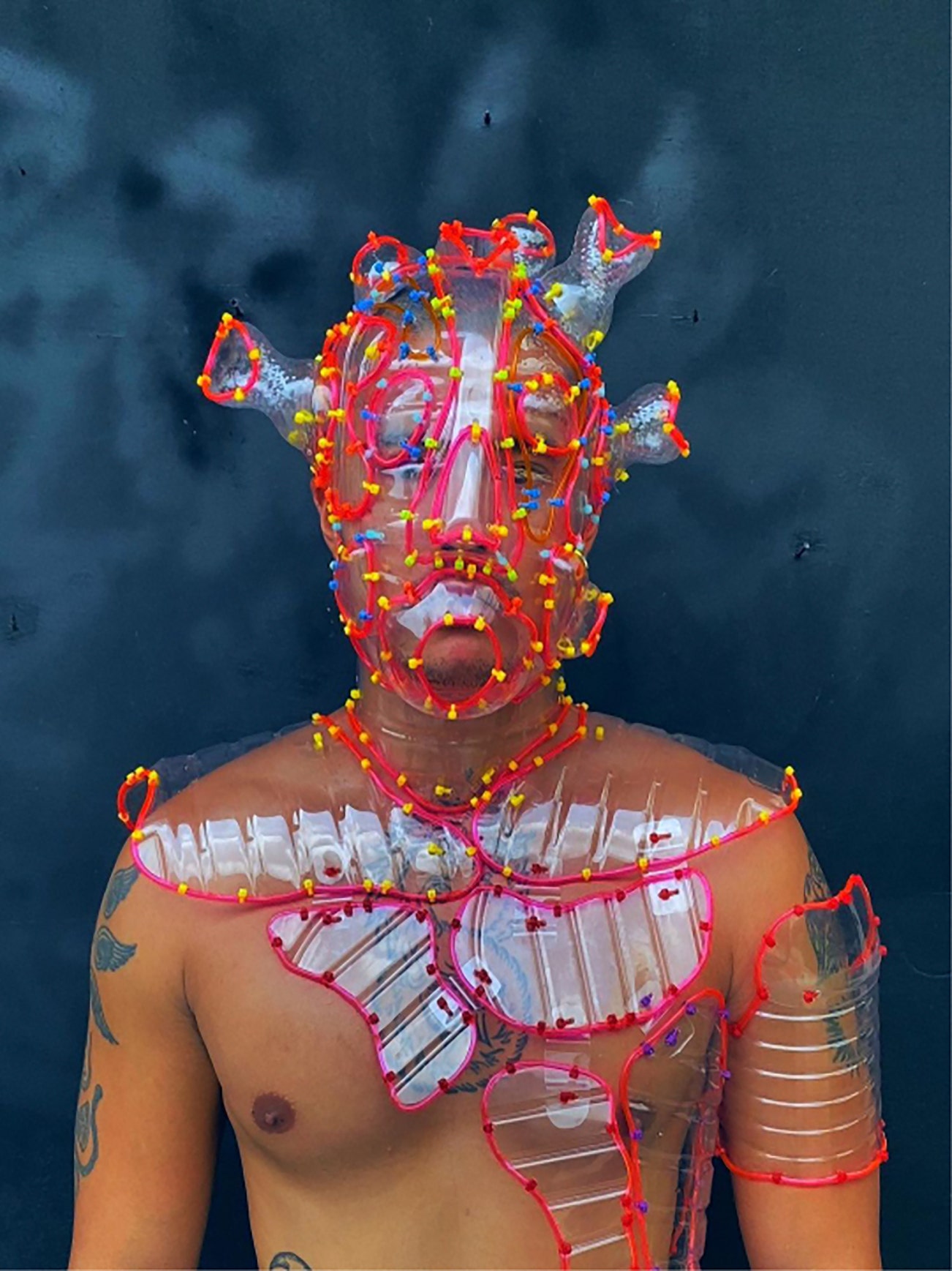 This artwork is made from plastic bottles and is part of a series of sculptural face-shields created during the height of the pandemic lockdown. A wearable piece of art, Frankenstein is typical of the three-dimensional works created by Leeroy New which inhabit the viewer’s space, creating an intimate physical relationship between the audience and artwork. New has become renowned for his elaborate sculptures which transform discarded materials into poignant works of art. These works compel us to examine the quantity of waste generated in our daily lives and the impact of this on our environment.
