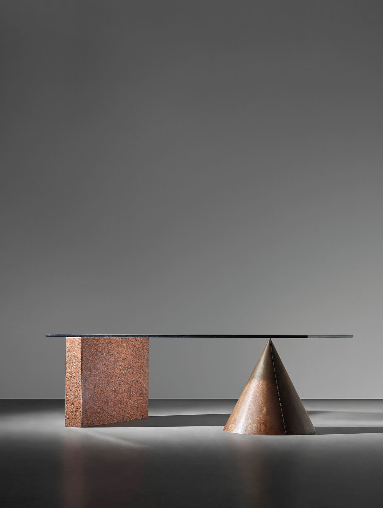 Granite, patinated copper, glass.