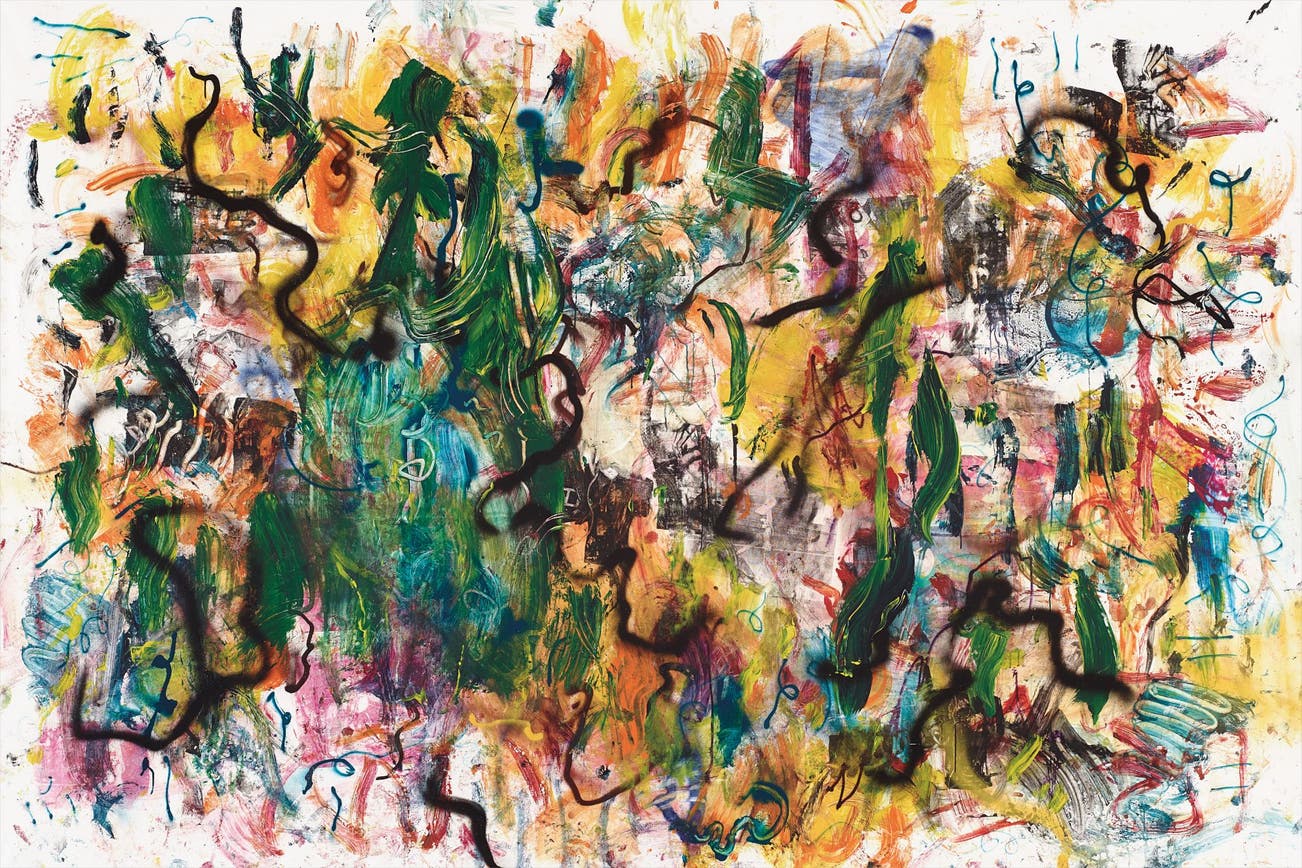 lacquer, spray paint, acrylic and silkscreen on canvas