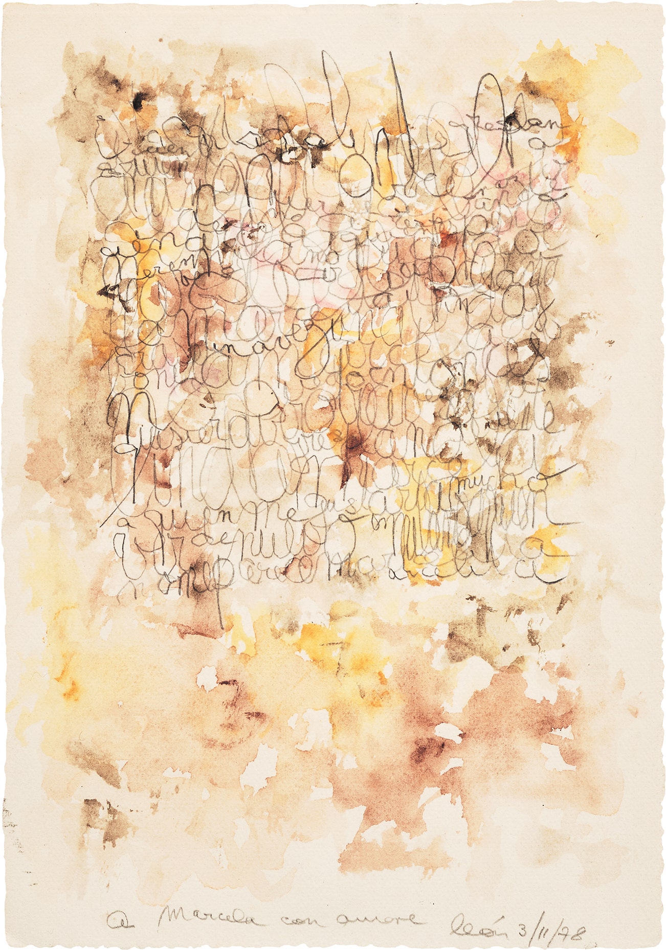 One particularly controversial work, La Civilización Occidental y Cristiana (Western Christian Civilization), was exhibited in 1965 and promptly censured by the Catholic Church, as the sculpture features a store-bought Jesus figure crucified to a U.S. fighter jet. However, Ferrari is probably best known for his "written drawings" that feature compositions of abstracted handwriting created in various mediums, conveying emotion and visual poetry.