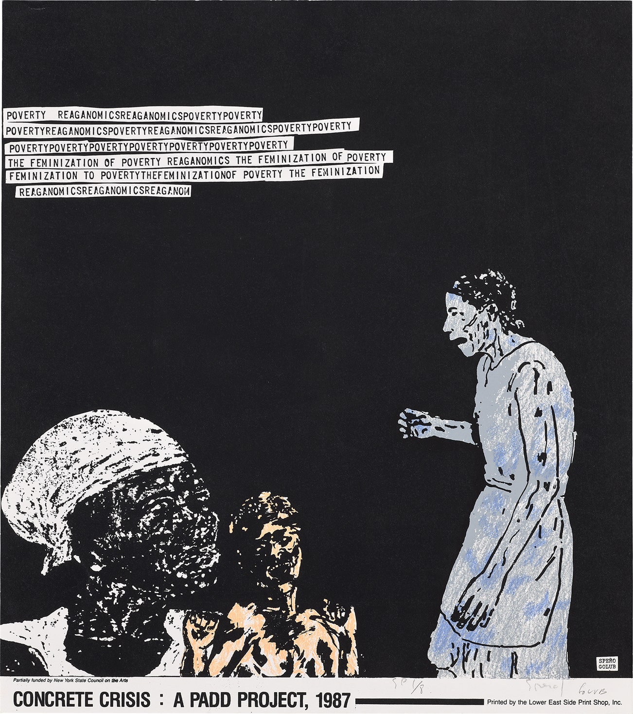 Signed by both artists and numbered 'SP 1/8' in pencil (a special proof, the edition was 50), co-published by the Lower East Side Printshop, Inc., and PADD (Political Art Documentation/Distribution), New York, in association with Exit Art, New York, unframed.