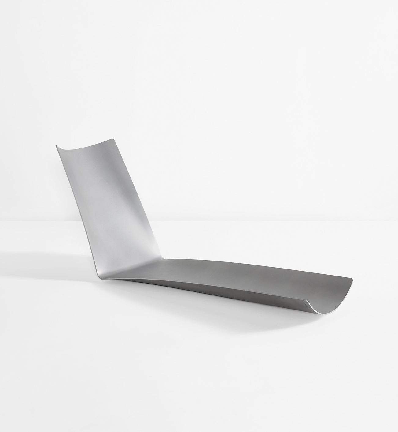 Leon Ransmeier is an American industrial designer and founder of the design practice Ransmeier Inc., founded in New York in 2010. The Two Step Lounge was designed for “Blow Up,” an exhibition at Friedman Benda, curated by Felix Burrichter, in which designers were asked to imagine a doll house expanded to human scale. Ransmeier stated that, “If dollhouses enable children to construct domestic fantasies, the distorted scale of Burrichter’s installation allowed me to realize an industrial fantasy.” The lounge was developed by first building miniature models from aluminum sheet by bending a pre-rolled sheet perpendicular to the axis. He then was able to produce the same effect at full scale. With one small fold, the raw material takes on the recognizable form of the chaise lounge. “I am drawn to the human silhouette in chaises lounges,” Ransmeier states. “They not only suggest a comfortable place to sit — in the way that chairs do — but demand relaxation, as you must relinquish contact with the ground.”