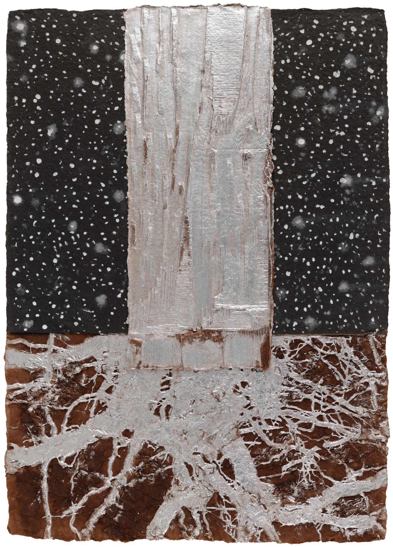 Pigmented and printed handmade paper in colors with collage and silver ink, the full sheet.