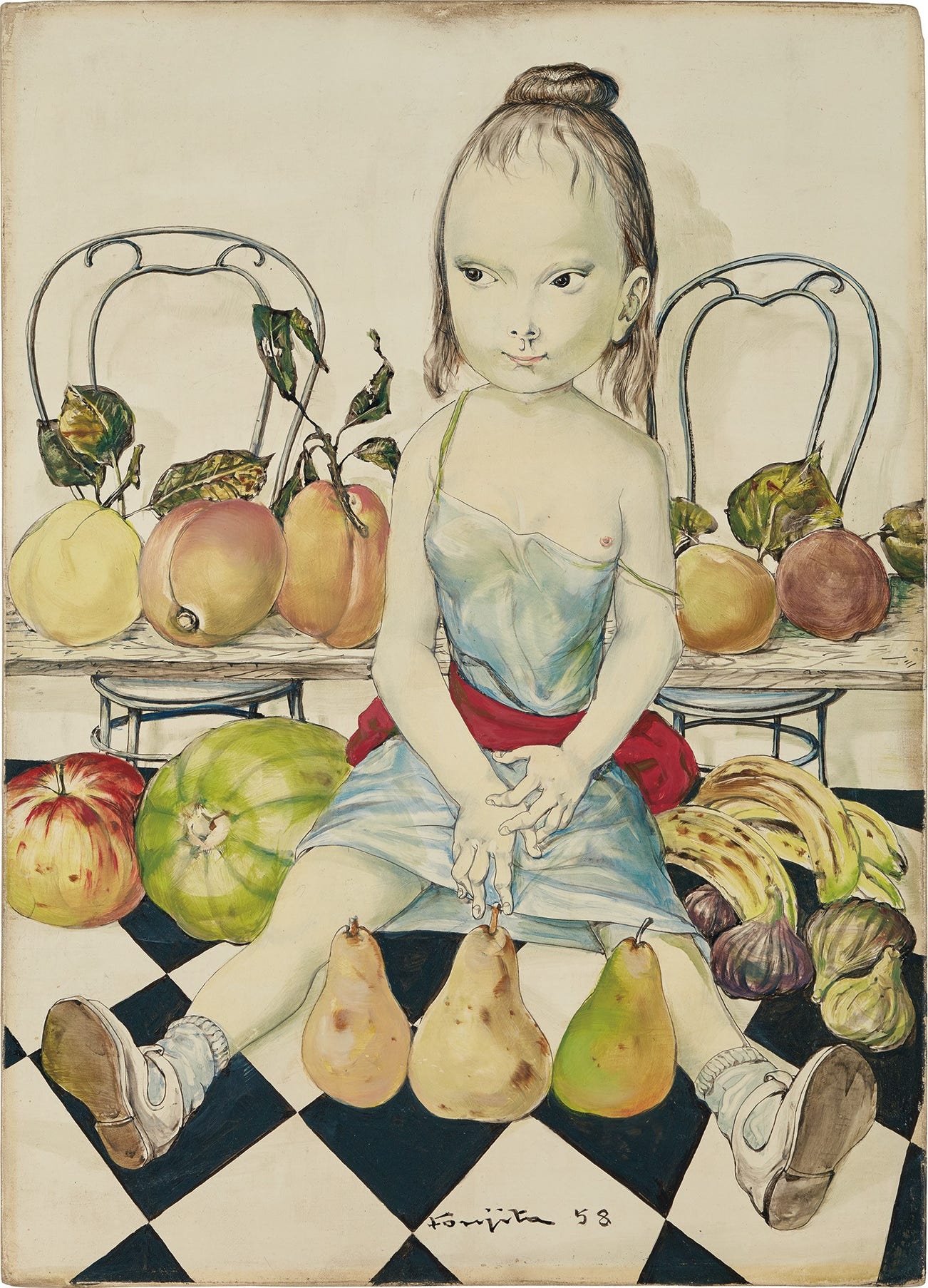 The Japanese-born artist had first moved to Paris at the age of 26, decades before he painted Fillette aux fruits et au damier and shortly before the outbreak of the First World War. There, he made his name, establishing his own artistic style and achieved great fame alongside his friends and fellow émigrés artists of the École de Paris such as Amedeo Modigliani, Moïse Kisling and Chaïm Soutine. In 1950, returning to France after a number of years abroad, including some spent in his native Japan, Foujita settled there permanently, acquiring French nationality in 1955. His style and subject matter during the 1950s take a very distinctive turn and, as in Fillette aux fruits et au damier, plunge the viewer into a world of children rich with allusions and symbols about Foujita’s personal life. The quintessential Parisian everyday life is depicted in the present work through the typically French geometric black and white marble flooring, as though Foujita was assimilating and immersing himself fully into his newfound nationality, yet he retains a nostalgic longing for the home of his youth through the juxtaposition of the steel chairs. While these chairs would call to mind the bistro cafes in the streets of Paris, they were in fact placed in Foujita’s home in Tokyo during the war.