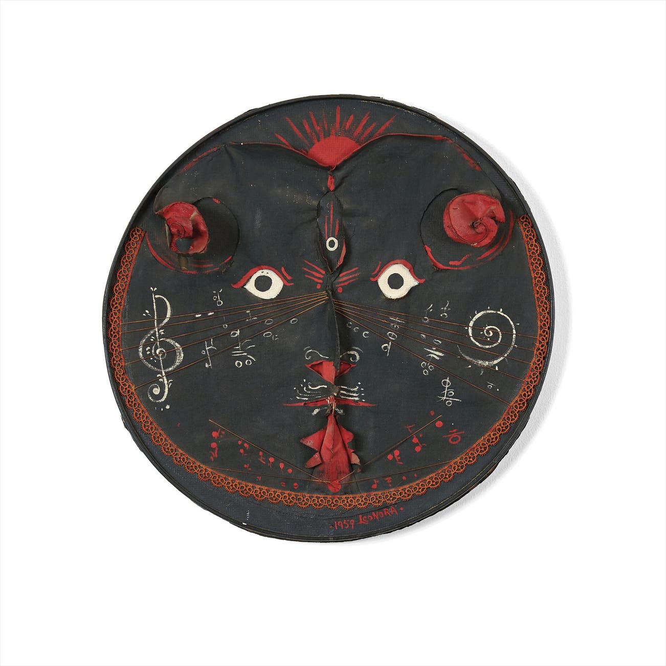 Carrington’s enigmatic paintings were influenced by children’s tales such as Alice in Wonderland, English Fairy Tales and The Arabian Nights. These stories populated Carrington’s imagination with princesses and nocturnal creatures such as cats and enchantresses. In the 1950s, when Carrington moved to Mexico, she immersed herself in the study of alchemy and the occult that she transposed into a repertoire of animals and symbols in her works. At this time, Carrington began experimenting with assorted media including polychrome wood sculptures, tapestries, as well as hand-sewing and embroidery. One important work from this experimental phase is Carrington’s arresting Cat Woman (La Grande Dame) from 1951. The present lot, Untitled (1959), is reminiscent not only of the 1951 sculpture but also of Carroll’s Cheshire cat that appeared to Alice. This work is suffused with fantastical and surreal elements, such as the hand sewn lace around the cat’s face and the wires used to symbolize whiskers, which also become sheet music filled with notes, imbuing the piece with a lyrical quality. In Mexico, Carrington formed an enduring friendship with Remedios Varo, with whom she met almost daily in her home filled with cats. Carrington believed Varo’s home had a magical atmosphere and it undoubtedly influenced the symbols and iconography she depicted in her works. During this time, her life was also entwined with Edward James, the renowned Surrealist collector. James was investing his fortune in the construction of an extraordinary open air sanctuary for animals in the tropical jungle of Xilitla. He invited Carrington to paint the murals of this sanctuary that came to represent, for Carrington, the incarnation of Alice in Wonderland. Not surprisingly, the animal world became a recurrent theme in her work, as in this remarkable cat. This period in Carrington’s work was also influenced by Coptic and Eastern Medieval figurative art, as seen in the red and white dots throughout the surface of the present lot, which represent the tree of life, known for its white and red berries that bestow immortality. More importantly, this work reflects Carrington’s feeling for animals as stated in a letter, “If gods exist, I don’t believe they have human form: I prefer to envision deities with the appearance of zebras, cats, or birds. Love guides all these species: only man makes a deity of Hate with his wars, his puritanism, the oppressions against his own species and the nature around him” (Seán Kissane, Leonora Carrington – Irish Museum of Modern Art, Irish Museum of Modern Art, Dublin, 2013, p. 89). Ultimately, when confronted with this powerful and beguiling creature, we are reminded that there is no key to easily decipher Carrington’s work, yet this sculptural painting attests to her innovative pictorial language, ensuring her place as one of the most important Surrealist painters from the twentieth century.
