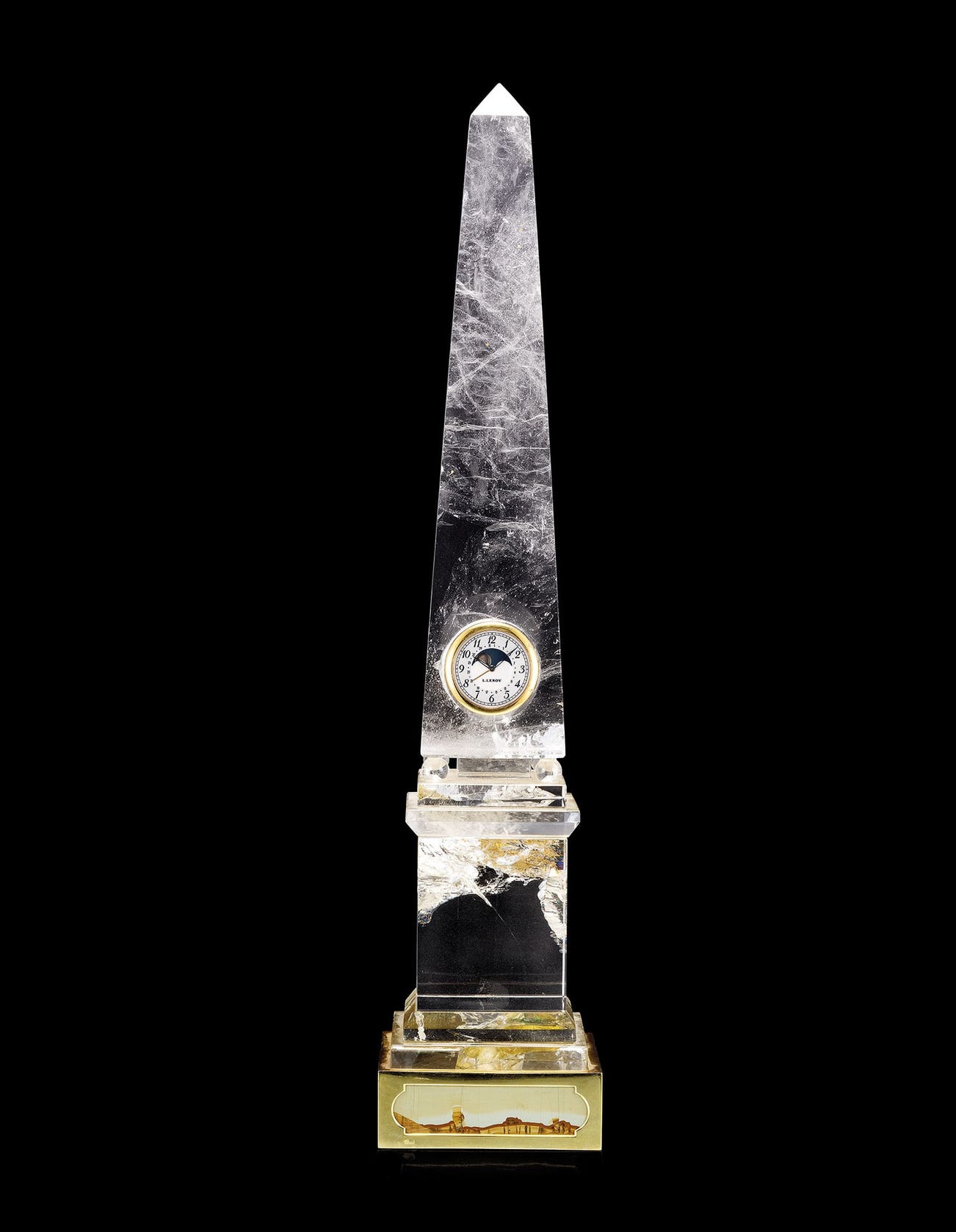 The present desk clock is a beautiful and tall rock crystal, gilted brass and scenic agate example manufactured by L.Leroy in circa 2000. The impressive one-piece rock crystal is exceedingly tough to cut as the natural mottling in the crystal can cause the stone to break through its inner fragments. Secured by a gilted brass and scenic agate set base, the mesmeric scenery depicted on each facet that is natural to the stone abstractly depicts an appealing scenic motif.