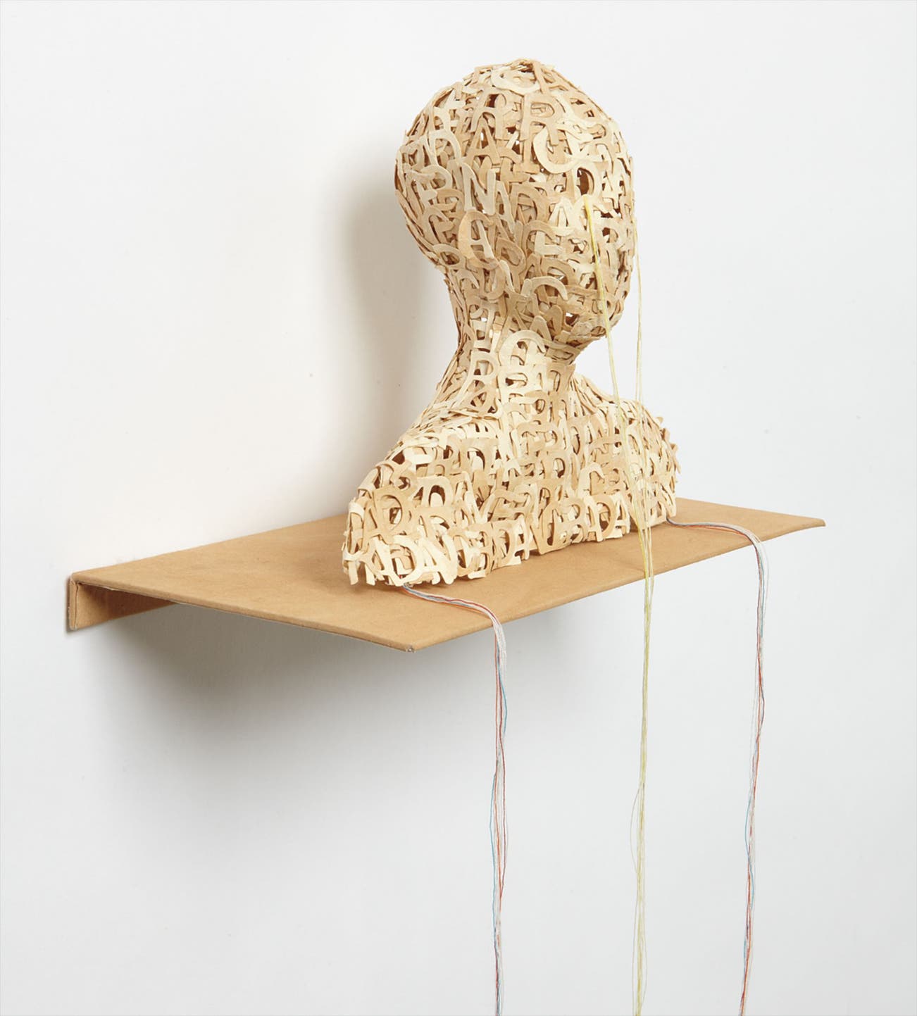 Three-dimensional work, comprised of cast die-cut abaca paper letters and thread, with original shelf,