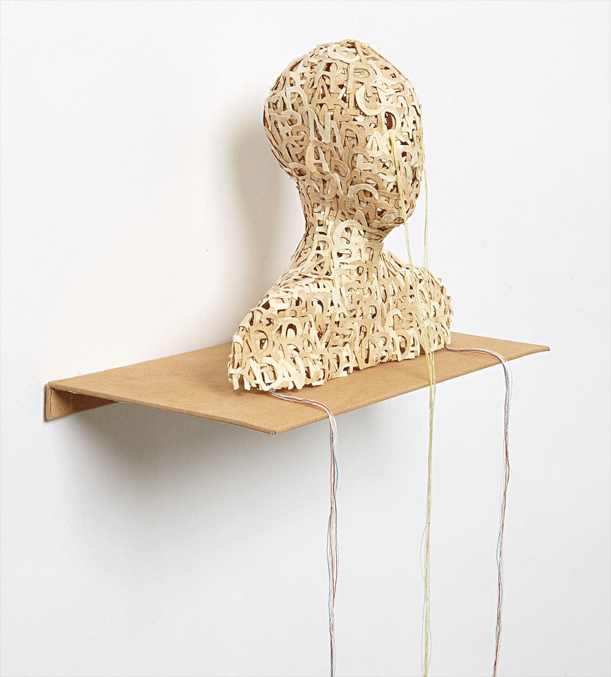 Three-dimensional work, comprised of cast die-cut pigmented abaca paper letters and thread, with original shelf,