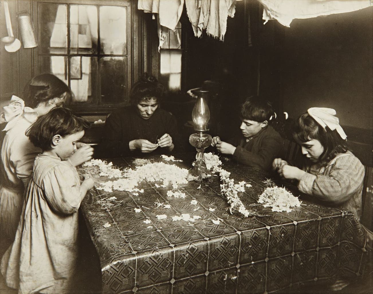 Credited and titled 'Tenement Homework' in pencil on the mount; credited in ink, 'Lewis W. Hine/ Interpretive Photography/ Hastings-on-Hudson, New York' credit and Walter and Naomi Rosenblum Collection stamps on the verso; typed descriptive title on a label affixed to the reverse of the mount.